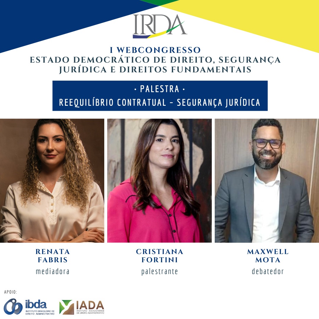 Com a mesa presidida por Renata Fabris, Presidente do IRDA, Cristiana Fortini é a palestrante convidada a falar sobre “Reequilíbrio Contratual – Segurança Jurídica”. Debatendo sobre o tema, Maxwell Mota de Andrade compõe o painel.