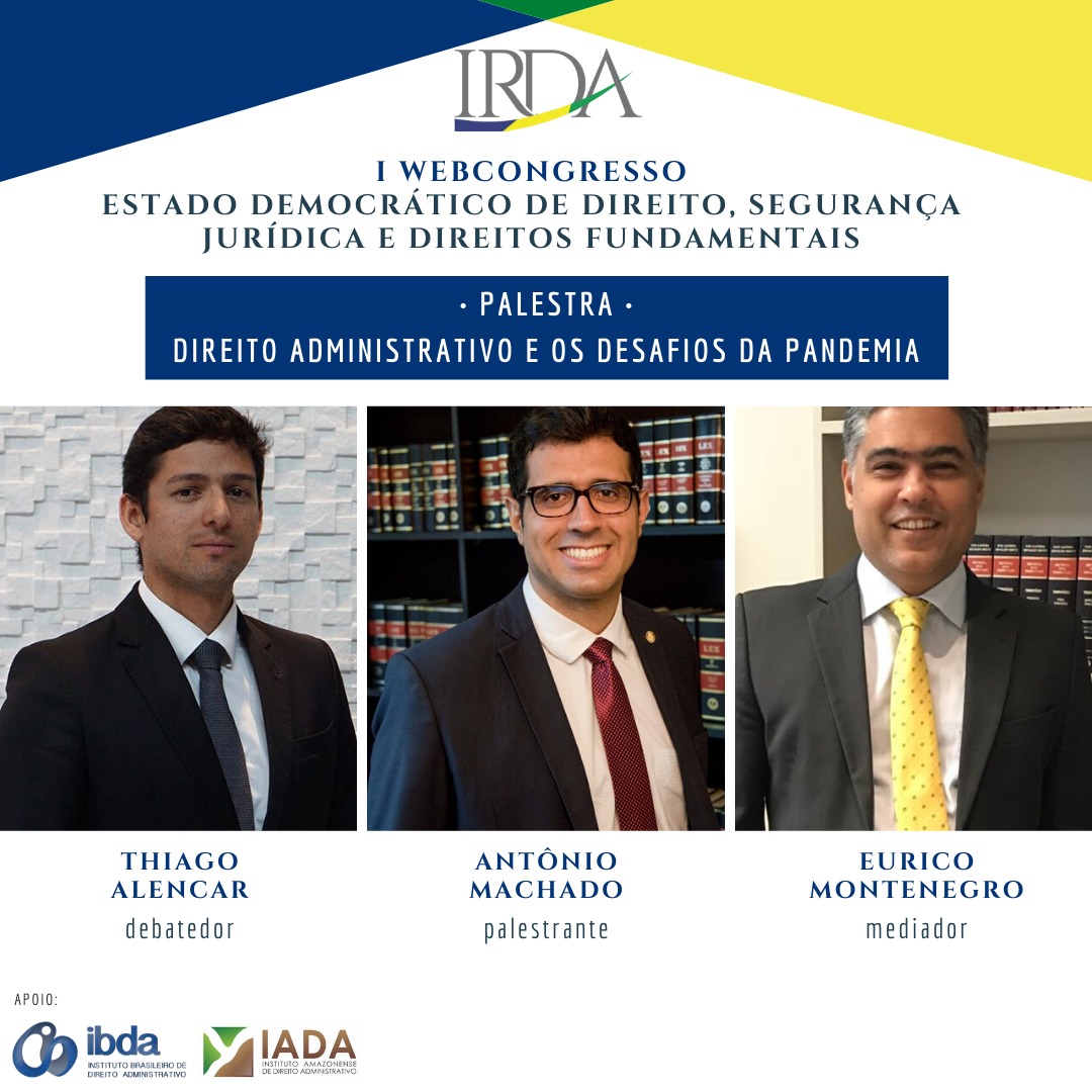 Fechando o primeiro dia de palestras do Webcongresso de Direito do IRDA, Eurico Montenegro Neto preside a mesa de debate. De um lado, o palestrante convidado Antonio Rodrigo Machado vem falar sobre “Direito Administrativo e os desafios da pandemia”, de outro, o debatedor Thiago Alencar Alves Pereira.